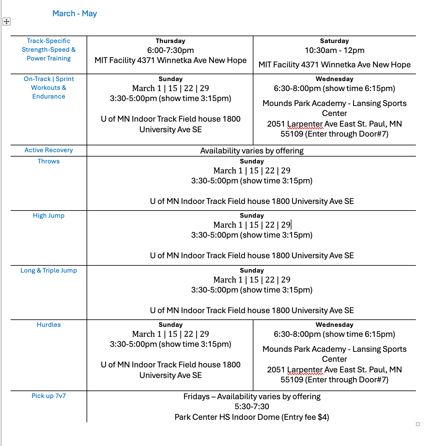 - Track-Specific Strength & Speed Training: Tuesday, Thursday, and Saturday